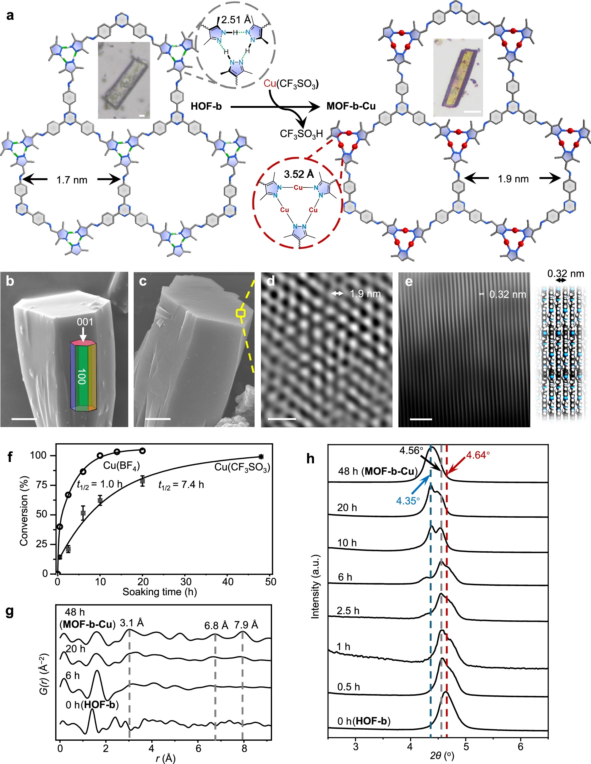 2)异质结构制备:将HOF-b单晶浸泡在12 mM Cu(CF₃SO₃)甲醇溶液中,298 K下反应48小时完成完全金属化,得到MOF-b-Cu;通过调控反应时间(0.5-20小时),制备出不同MOF域占比的MOF|HOF|MOF异质结构。
