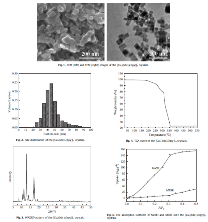 1. 材料表征:SEM/TEM显示[Cu₂(bdc)₂(bpy)]ₙ为立方颗粒,粒径35-55 nm;WAXRD证实其晶型;TGA表明200℃以下热稳定;IGA测试显示MeOH最大吸附量155.4 mg·g⁻¹,远高于MTBE。