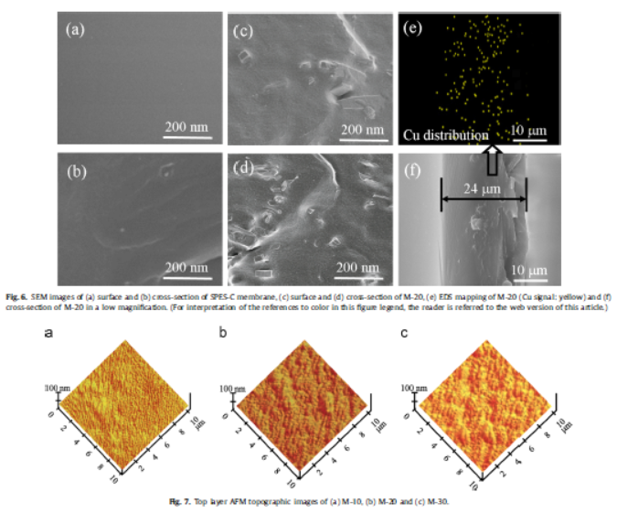 2. 膜性能测试:AFM显示膜表面粗糙度随填料负载量增加而增大(M-30的RMS为14.981 nm);PALS测试表明,填料负载30 wt%时,自由体积半径0.335 nm、自由体积分数10.557%;EDS证实Cu元素均匀分布。