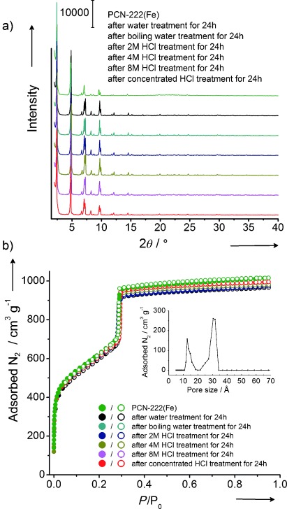 3. 稳定性测试:将PCN-222(Fe)浸泡于水、沸水、不同浓度HCl中24h,检测结构完整性。