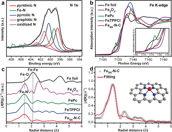 3. 成分与电子结构:XPS和XAS表明Fe以Fe-N₄配位存在,Fe为+δ价;元素分析得N含量4.67 wt%。