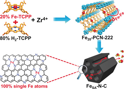 2. 催化剂制备:Fe₂₀-PCN-222在800℃热解,去除ZrO₂后得到Feₛₐ-N-C,Fe负载量1.76 wt%。