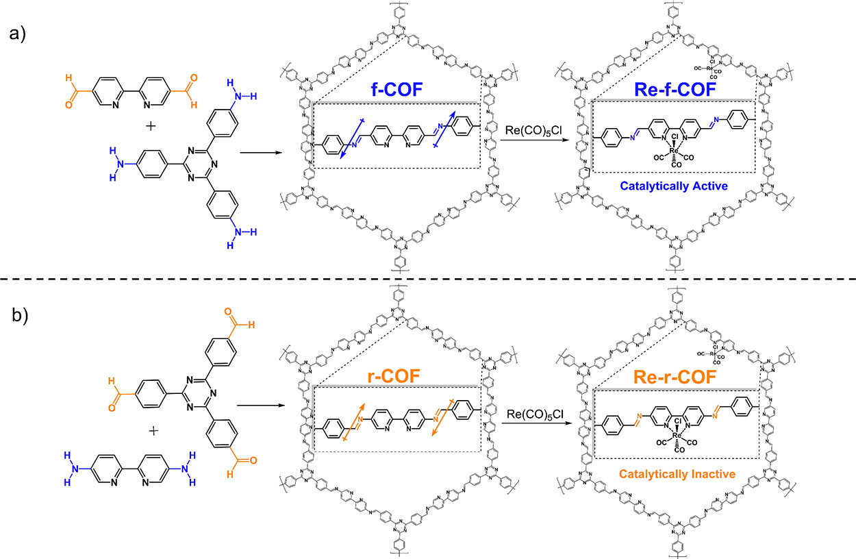 图1:(a)f-COF和Re-f-COF的合成方案以及(b)r-COF和Re-r-COF的合成方案;它们由COF单体构建,其中胺基和醛基官能团被切换。