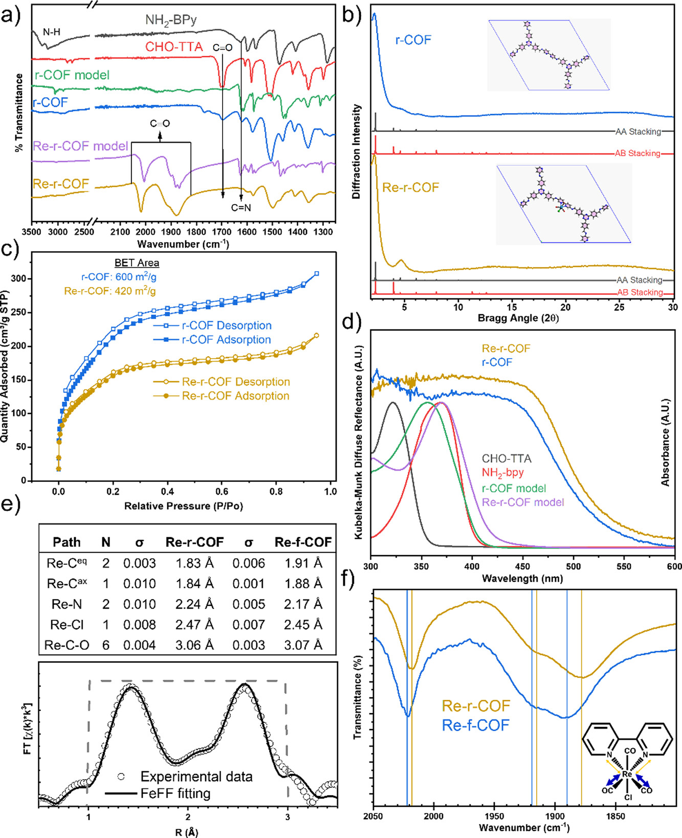 图2. (a)r-COF和Re-r-COF的FTIR光谱。还显示了单体和小分子模型的光谱进行对比。(b)r-COF和Re-r-COF的实验和模拟(AA和AB堆叠模式)PXRD图案。(c)r-COF和Re-r-COF的N2吸附等温线,表面积为BET计算结果。(d)r-COF和Re-r-COF的UV-可见漫反射光谱以及乙腈溶液中单体和小分子模型的吸收光谱。(e)带有拟合参数的Re-r-COF的EXAFS拟合(上)和R-空间拟合(下)。注意:两个Re−C−O的前向散射退化。(f)Re-f-COF和Re-r-COF中(Re)-C[1]O伸展的FTIR光谱,通过经过零交叉点确定的峰值绘制参考线。