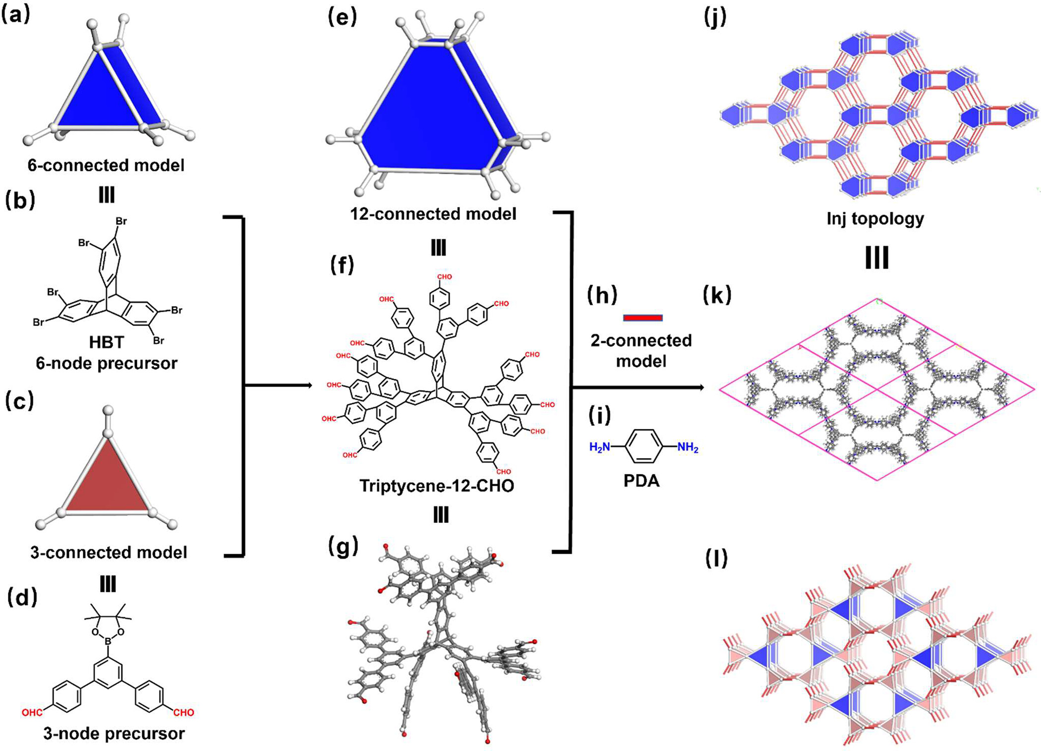 图1. 合成12连接固有多节点构建单元(Triptycene-12-CHO)和具有lnj拓扑结构的3D COF(3D-lnj-COF)