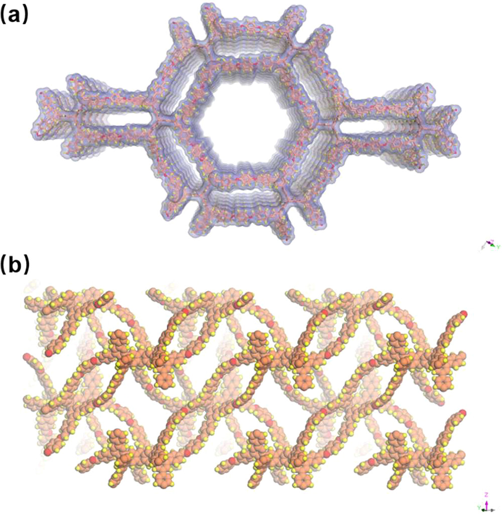 图2. 从顶视图(a)和侧视图(b)呈现多孔3D-lnj-COF的结构表示
