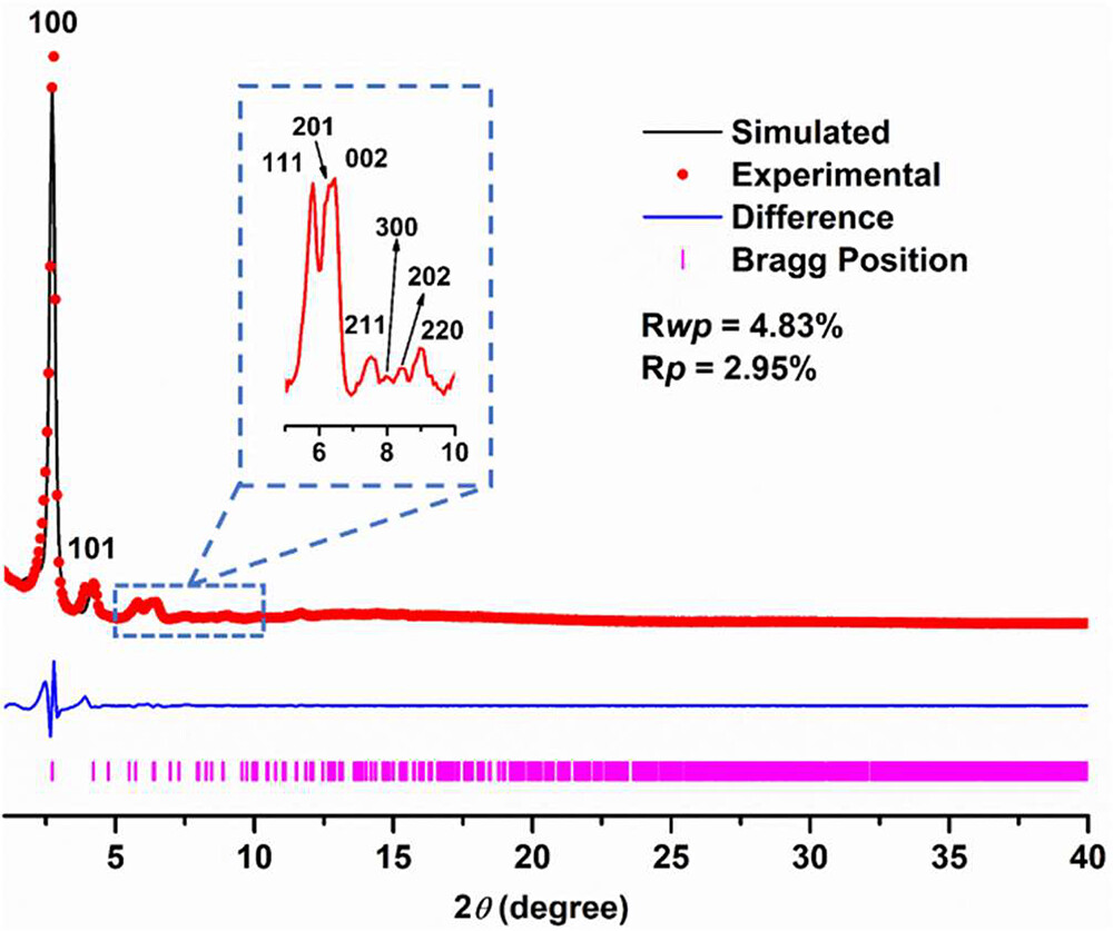 图3. 3D-lnj-COF的PXRD图谱。实验图谱(红色曲线)、Pawley精修图谱(黑色曲线)以及从lnj模型结构计算得到的图谱(品红色曲线)及其差异(蓝色曲线)。插图为5°至10°的放大视图。