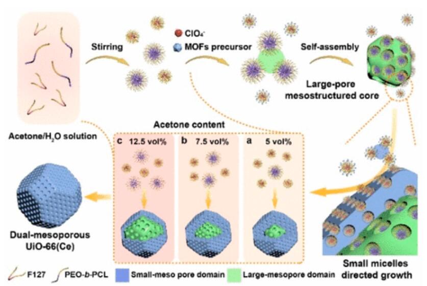 本文报道了一种使用双嵌块共聚物PEO-b-PCL和F127作为软模板,合成具有可调节双介孔和核壳结构的层状Ce基MOF的共模板策略。所得MOF具有高比表面积和两组统一的孔径约为9.5 nm和24 nm的介孔,分别来源于F127和PEO-b-PCL。通过调节两种模板的添加量比例和改变合成体系的极性,可以简单地调控壳层的厚度。这种简便的共模板组装方法有望为探索设计具有复杂多模介孔结构的MOF打开新的机遇,用于各种应用。
