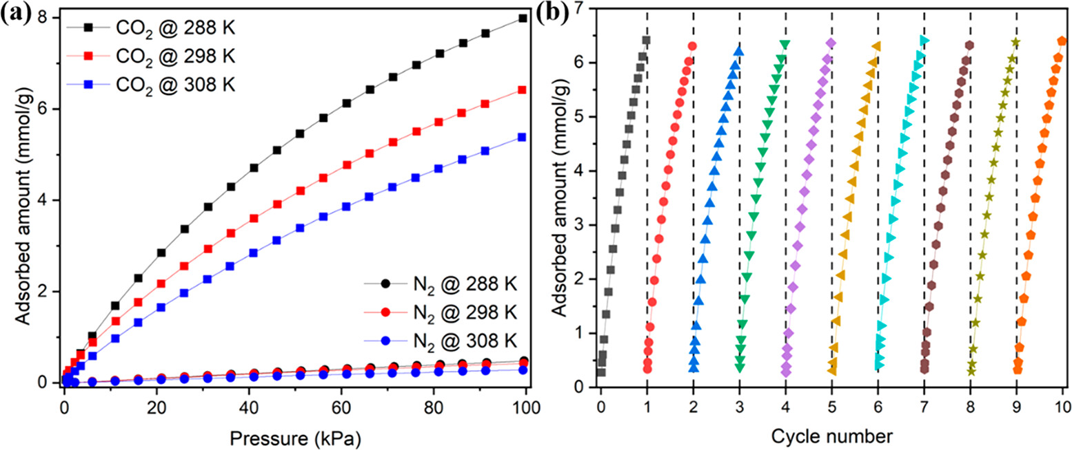 2)Fe-dbai具有6.4 mmol/g的高CO2吸附容量和64的CO2/N2选择性。更重要的是,Fe-dbai在60% RH条件下保留94%的CO2工作容量,表现出其他MOF材料难以达到的潮湿稳定性。