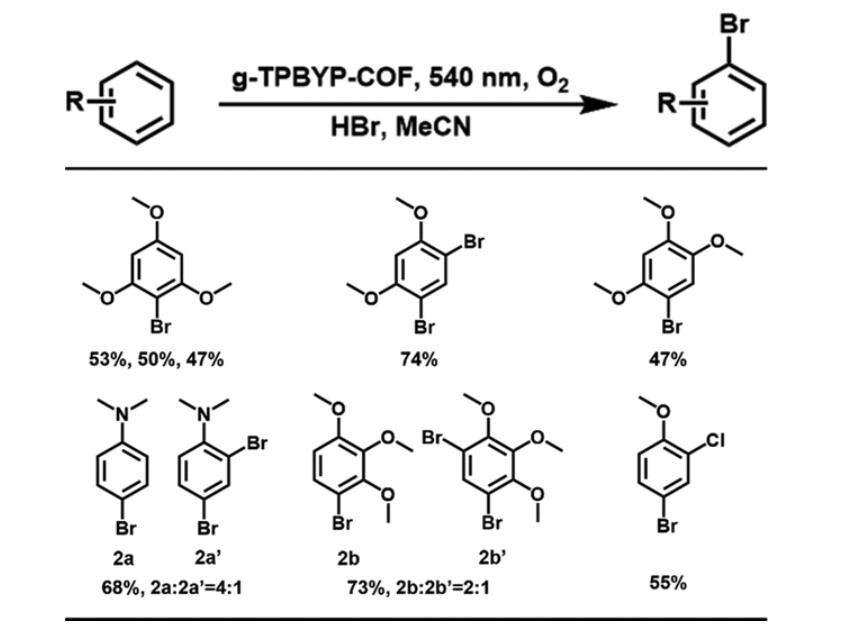 3)该COF结构可有效生成活性氧,可于绿光下催化溴化反应,并通过孔径效应调控产物区域选择性。