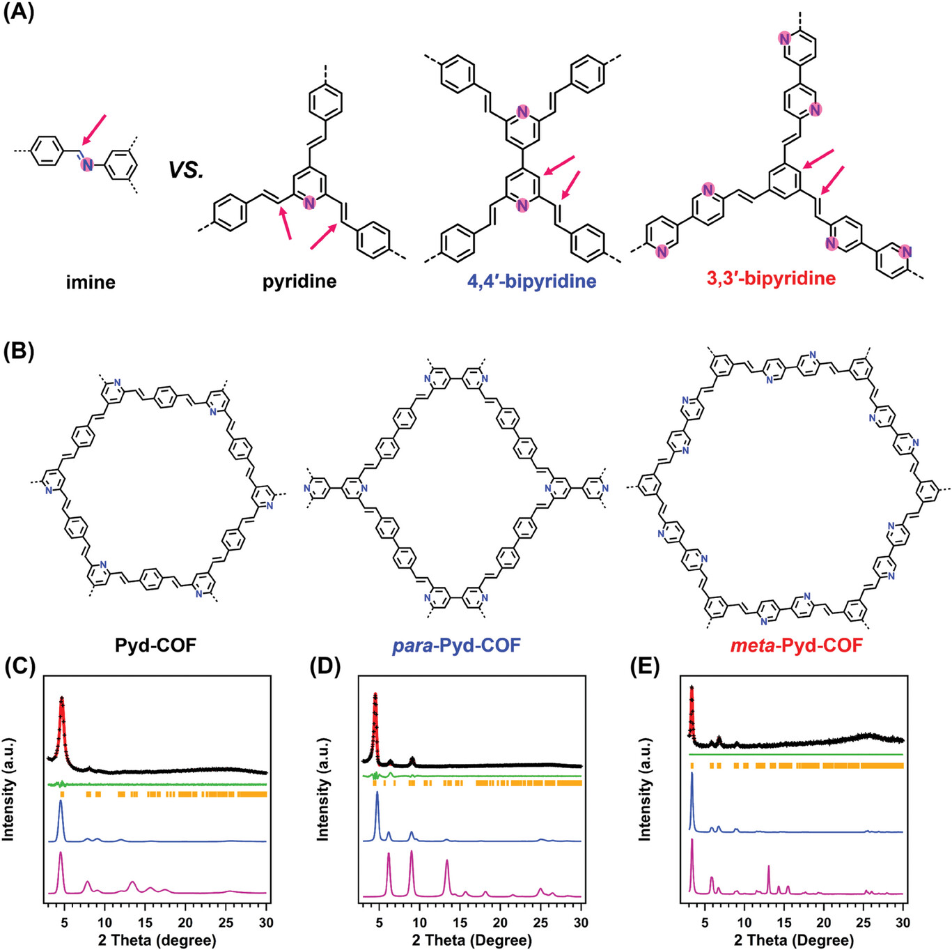 1)分别利用2,4,6-三甲基吡啶和间苯二甲醛合成Pyd-COF; 利用4,4'-联吡啶和4,4'-联苯二甲醛合成para-Pyd-COF; 利用6,6''-二甲基-3,3''-联吡啶和1,3,5-三甲基苯合成meta-Pyd-COF;