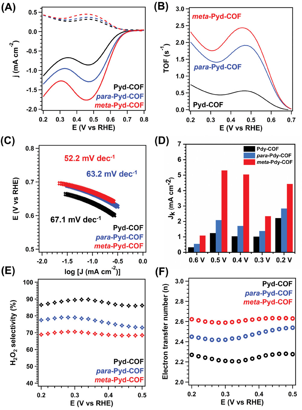 3)测试了三种COF作为氧还原反应催化剂的活性和选择性。其中Pyd-COF的H2O2选择性最高,达到89.8%;meta-Pyd-COF的催化活性最高。