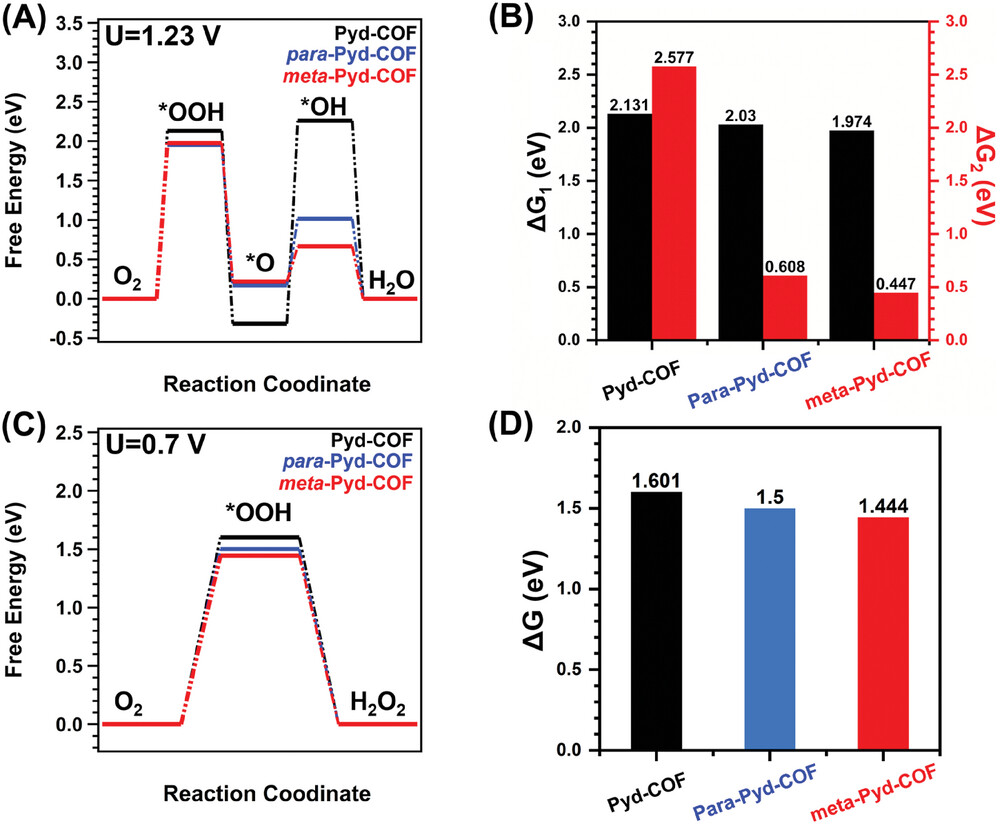 5)计算结果表明三种COF中氧分子的结合能强弱顺序为:meta-Pyd-COF > para-Pyd-COF > Pyd-COF;动力学测试表明meta-Pyd-COF的催化活性最高;环盘电流法测试表明Pyd-COF生成H2O2的选择性最高。