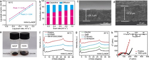 3)CV、EIS和dQ/dV分析表明,电化学反应具有良好的可逆性,且主要是表面控制的储能过程。实验结果证明HAN-Cu-MOF电极具有优异的化学和机械稳定性,能够抵抗高温下的溶解和体积膨胀。