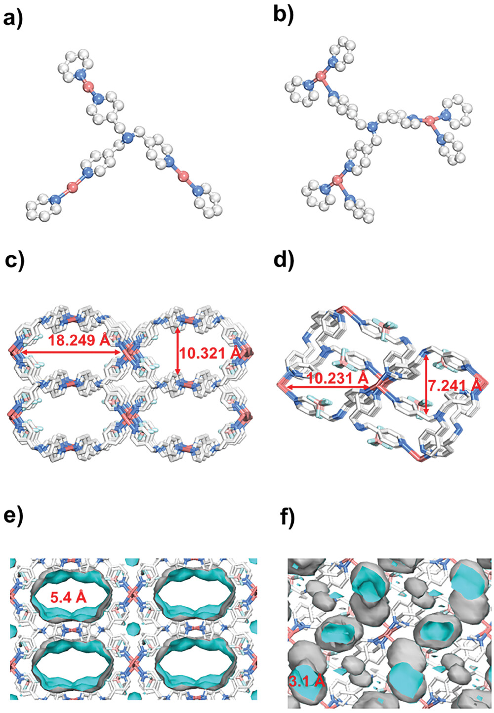 2)通过N2吸附实验和CO2吸附实验表征了FJI-H39和FJI-H40的孔径和比表面积。结果显示,FJI-H39的孔径为5.4 Å,比表面积为165 m2 g-1,而FJI-H40几乎不吸附N2或CO2,可能是因为其孔径小于分子的动力学直径。