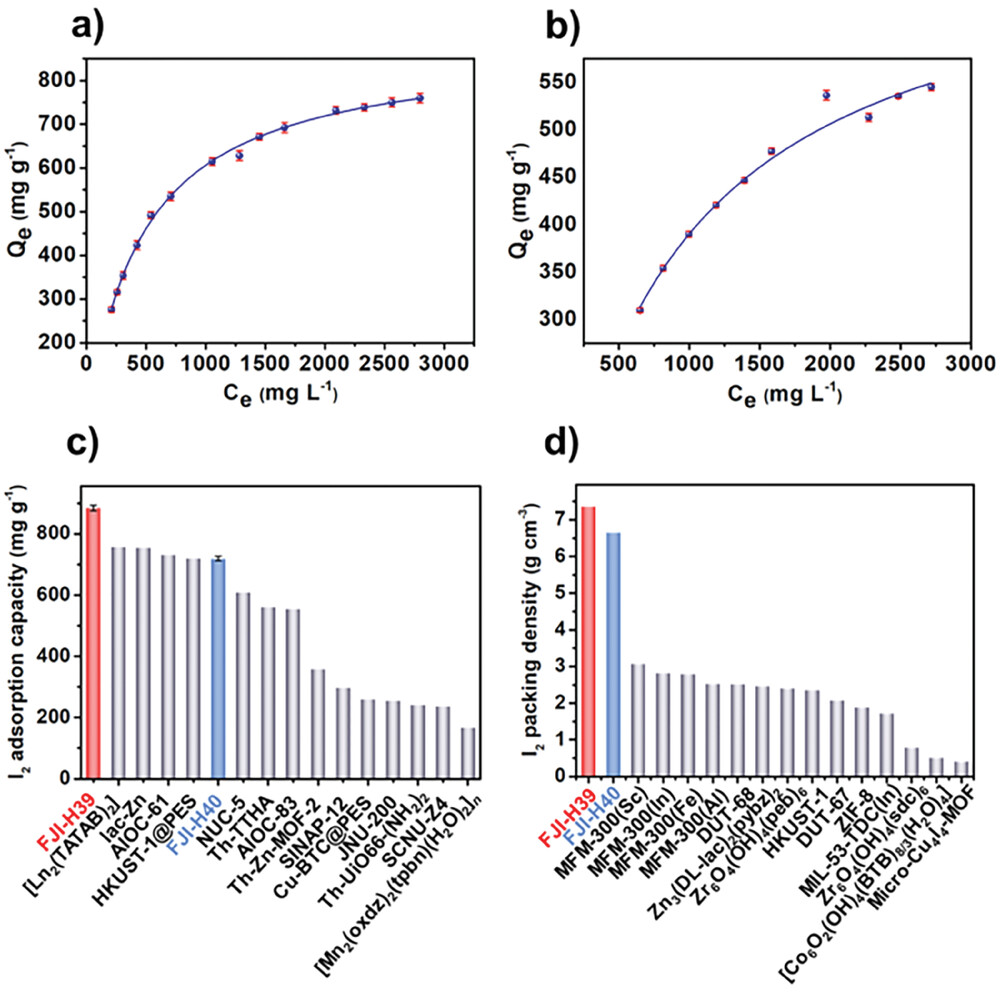 5)通过分析FJI-H39和FJI-H40对I2的吸附等温线,作者得出FJI-H39的I2吸附容量为884.96 mg g-1,I2存储密度达到了7.37 g cm-3,远高于固态I2的密度。