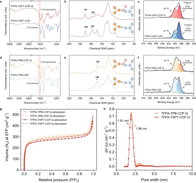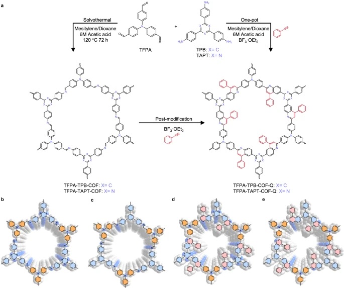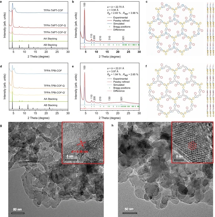 1)通过Povarov反应合成了两种喹啉连接的共价有机框架材料TFPA-TAPT-COF-Q和TFPA-TPB-COF-Q。作为对照,还合成了相应的亚胺连接的COF材料TFPA-TAPT-COF和TFPA-TPB-COF。此外,还通过TFPA-TAPT-COF和TFPA-TPB-COF的后修饰法合成了TFPA-TAPT-COF-Q’和TFPA-TPB-COF-Q’。