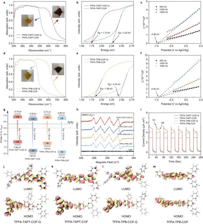 6)EPR实验在可见光照射下检测到DMPO-O2•-加合物的特征信号,表明TFPA-TAPT-COF-Q和TFPA-TPB-COF-Q能够光催化产生超氧自由基。瞬态光电流响应曲线显示TFPA-TAPT-COF-Q具有更高的光电流强度,表明其具有更高的电荷分离效率。