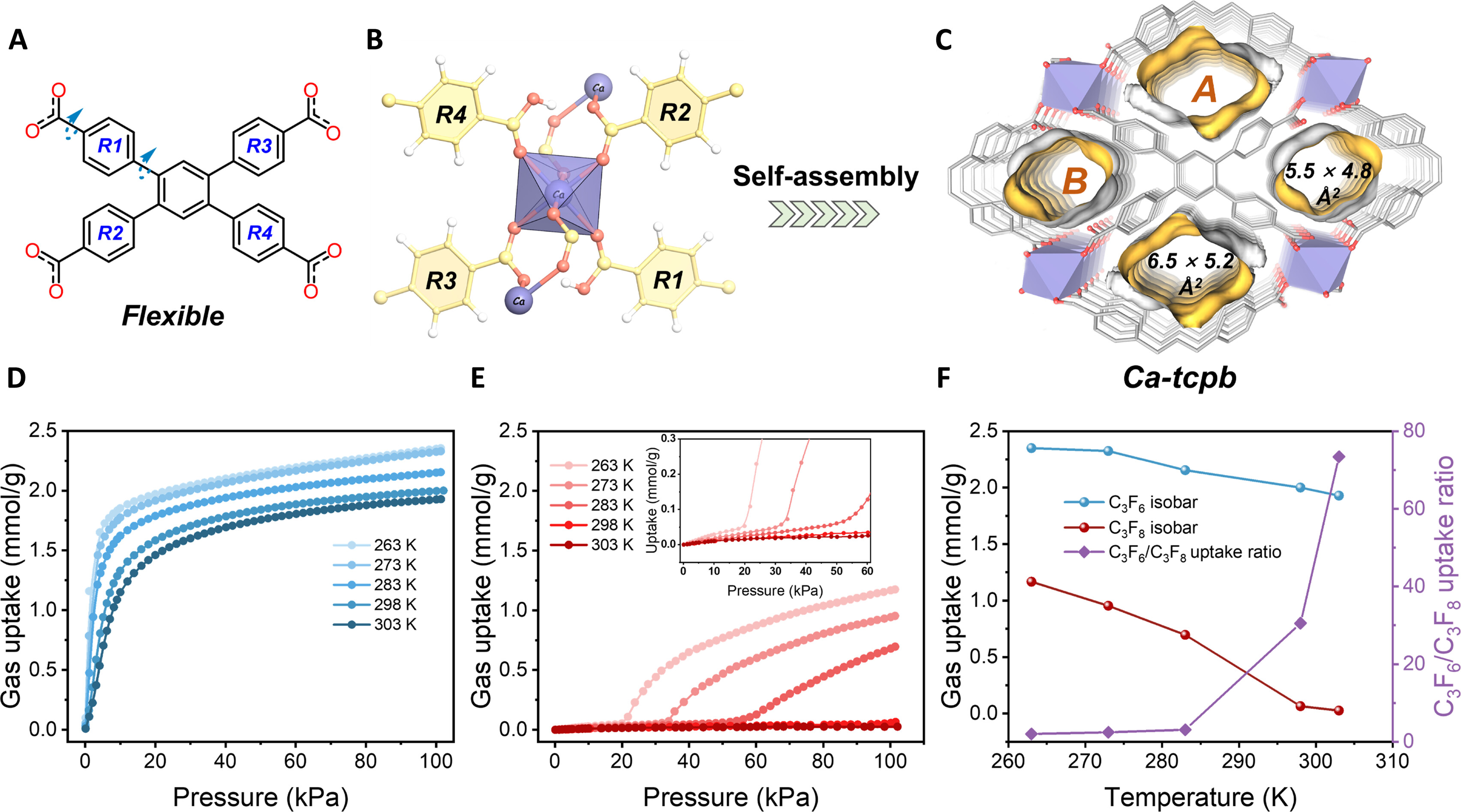 浙江大学陈俐吭&鲍宗必老师等和福建师范大学张章静老师等报道的这篇文章中(Sci. Adv.10, eadj6473)报道了一种具有温度调控门效应的柔韧金属有机框架(Ca-tcpb),能够实现C3F8/C3F6分离,得到高纯度的C3F8。通过实验和理论计算揭示了框架与气体之间的相互作用。