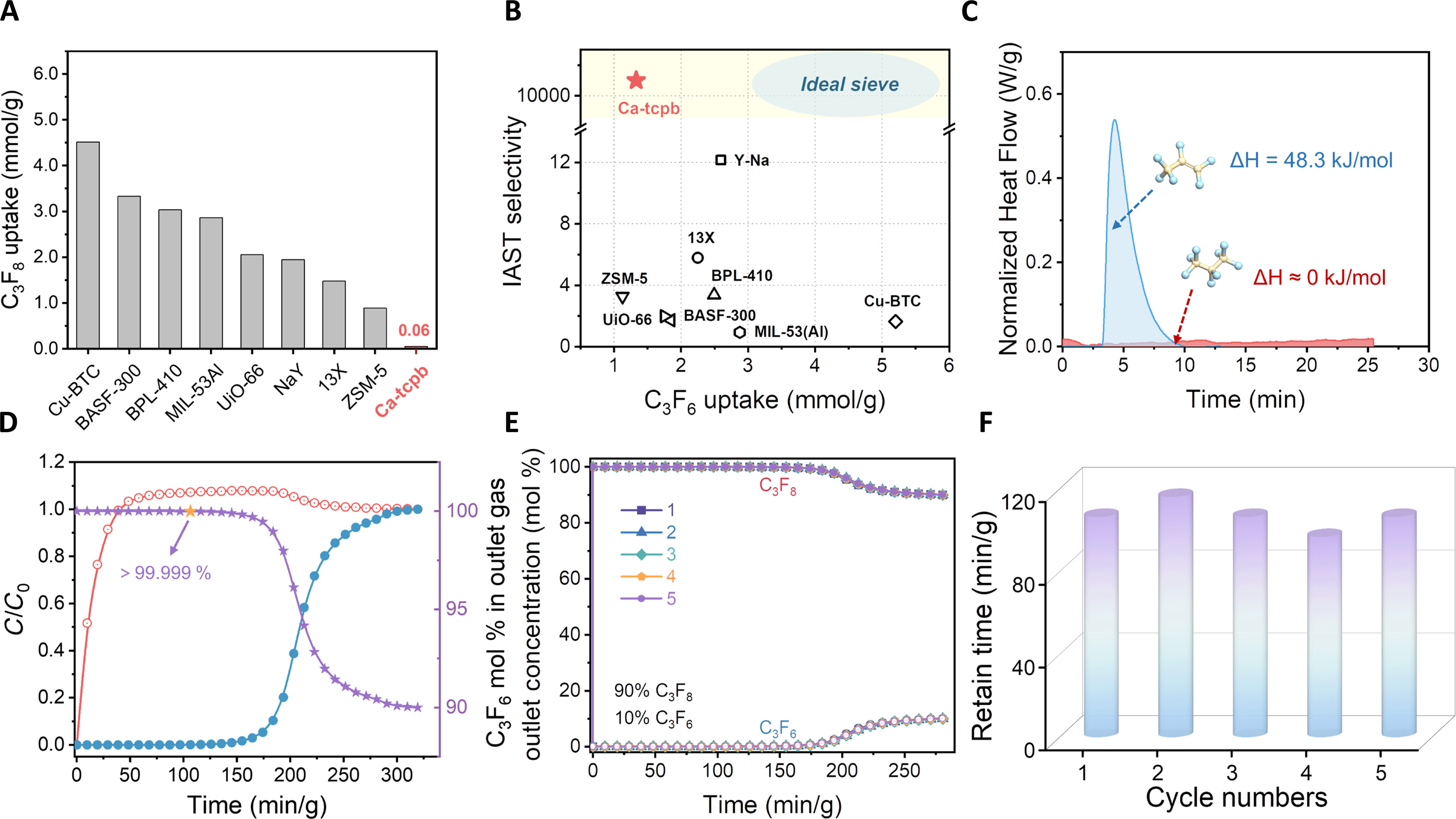 2)通过实验验证和结构表征,揭示了基于温度响应的筛选效应,实现了对C3F8的有效排斥和高效分离。