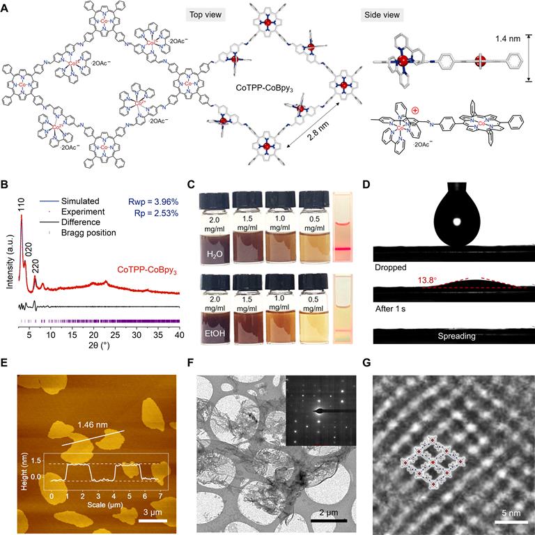 通过透射电子显微镜(TEM)和原子力显微镜(AFM)成像观察得到CoTPP-CoBpy3 COF的大型(>2μm)和薄(约1.45nm)纳米片形态,且高度有序。