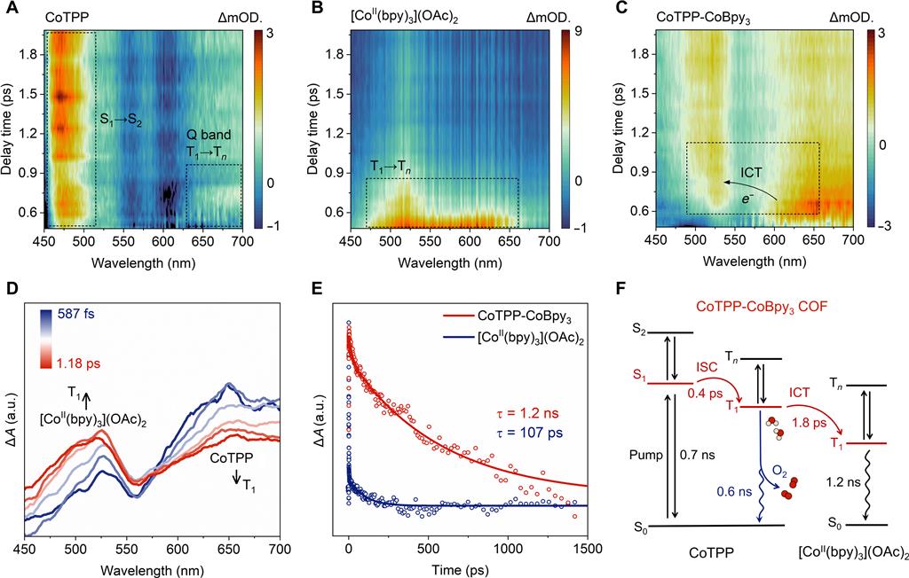 4)通过飞秒瞬态吸收光谱(fs-TA)测试,揭示了CoTPP-CoBpy3 COF的超快三重态CoTPP到CoBpy3的内部电荷转移(ICT)(1.8 ps)和延长的电荷分离状态(τ = 1.2 ns)。光电流实验验证了在光照下CoTPP-CoBpy3的高光电流密度。