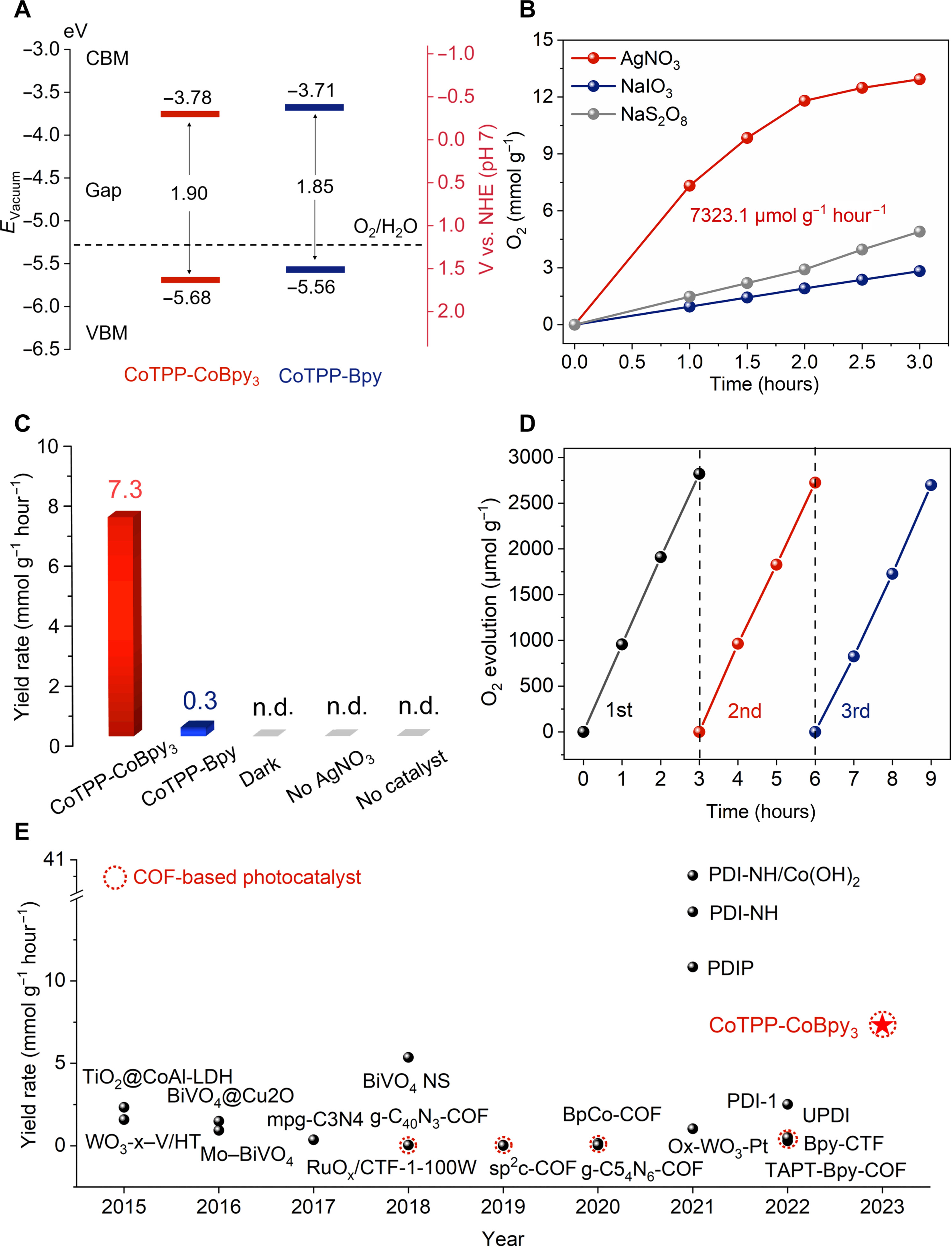 3)作者通过设计和合成CoTPP-CoBpy3 COF,在水氧化方面取得了突破。该COF具有优秀的分散性、水亲和性和超快的电荷分离效应,实现了高效的光催化氧气产生。