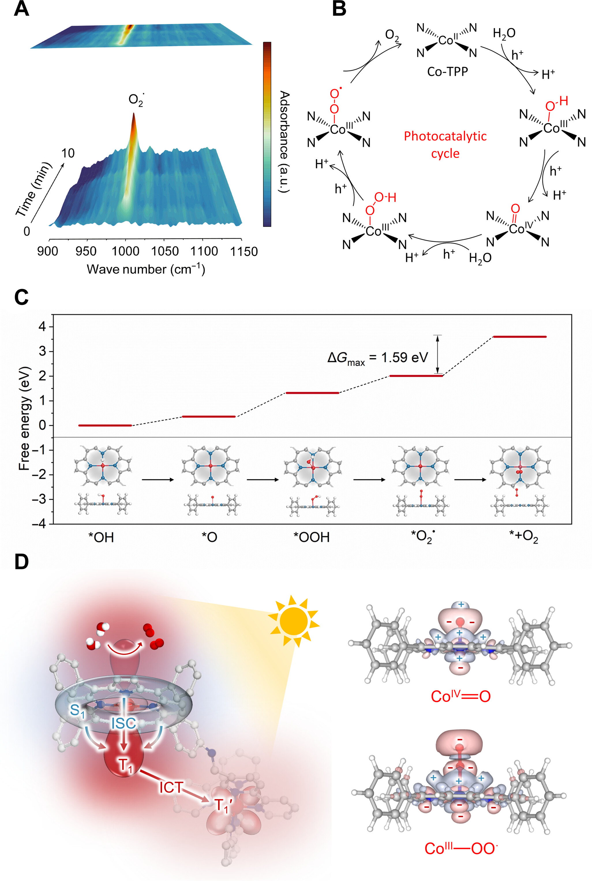 5)通过原位衰减全反射红外光谱(in situ ATR-IR)和密度泛函理论计算,探究了光催化氧发生的机制和热力学,在CoTPP-CoBpy3 COF中观察到了末端超氧化物中的单个钴金属活性位点。