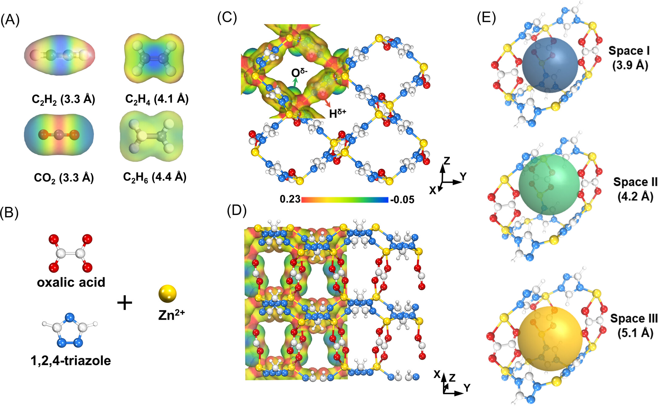 (3) 本文作者在前人工作基础上,利用配位组装策略,通过将不同配体携带的特异性基团引入框架,构筑出具有合适孔径和多重结合位点的分子捕获剂Zn-trz-ox,可同时高效去除C2H2、C2H6和CO2杂质,实现了一步法乙烯纯化。