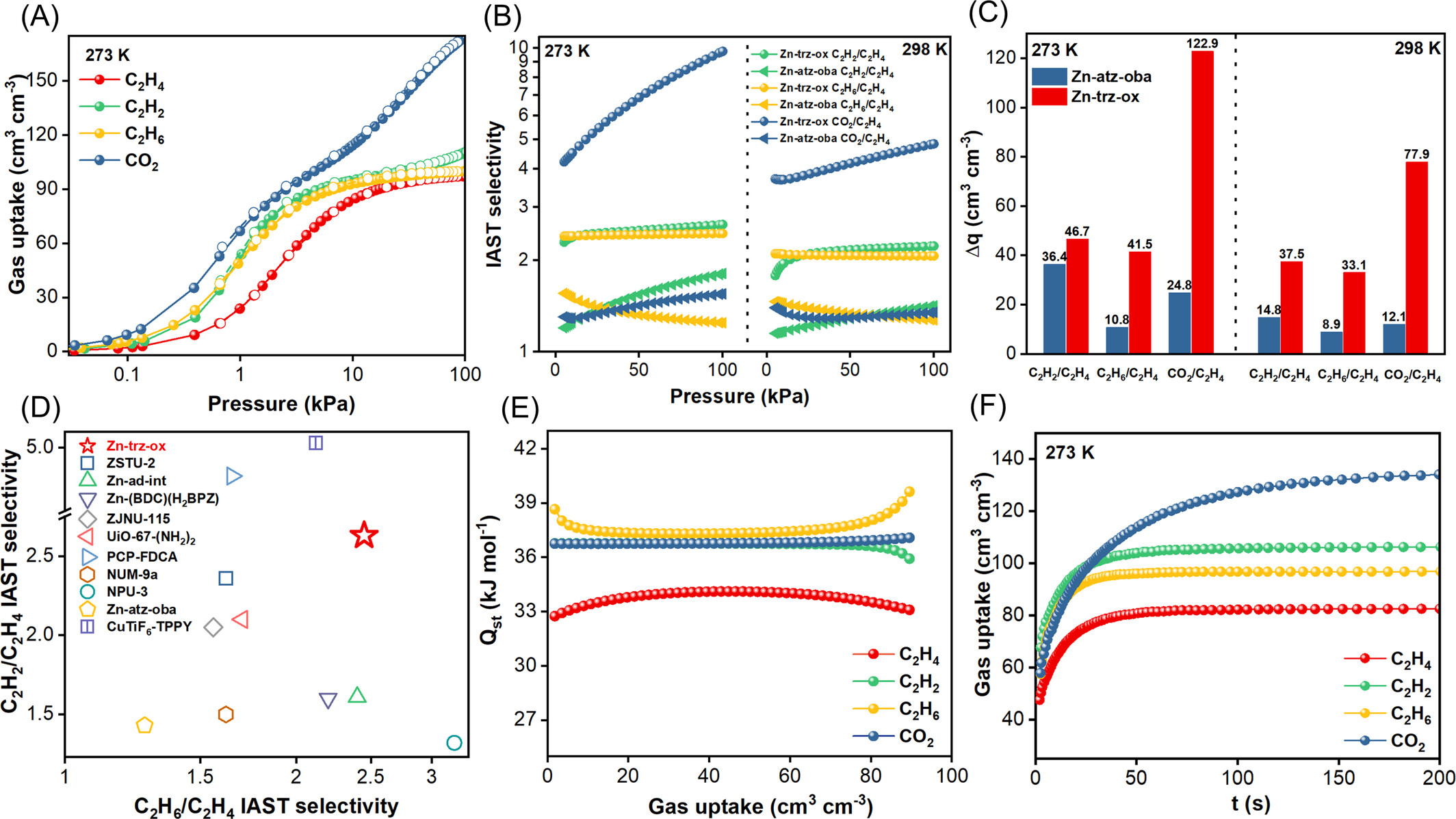 (3) 在273K和100 kPa下,Zn-trz-ox对CO2/C2H4、C2H2/C2H4和C2H6/C2H4的IAST选择性分别达9.8、2.6和2.5,高于此前最好的Zn-atz-oba材料。