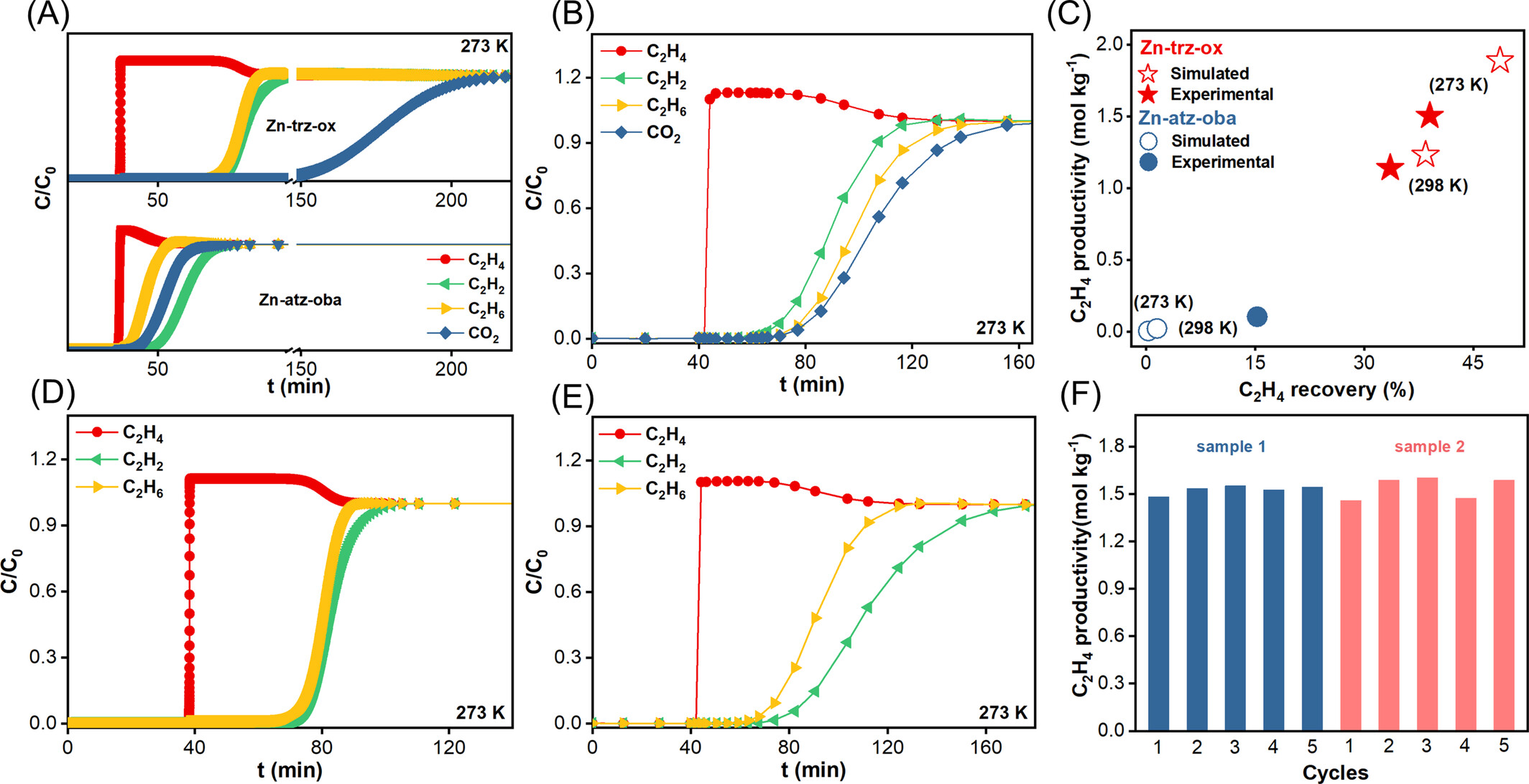 (3) 通过动态穿透实验和模拟,评估了Zn-trz-ox从C2H4/C2H2/C2H6/CO2和C2H2/C2H6/C2H4混合气中分离C2H4的性能,获得了高纯C2H4。相比现有材料,Zn-trz-ox展现了更高的C2H4纯度和产率,实现了基准一步法乙烯纯化。