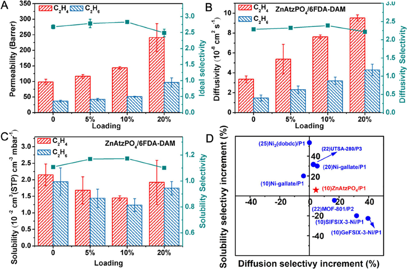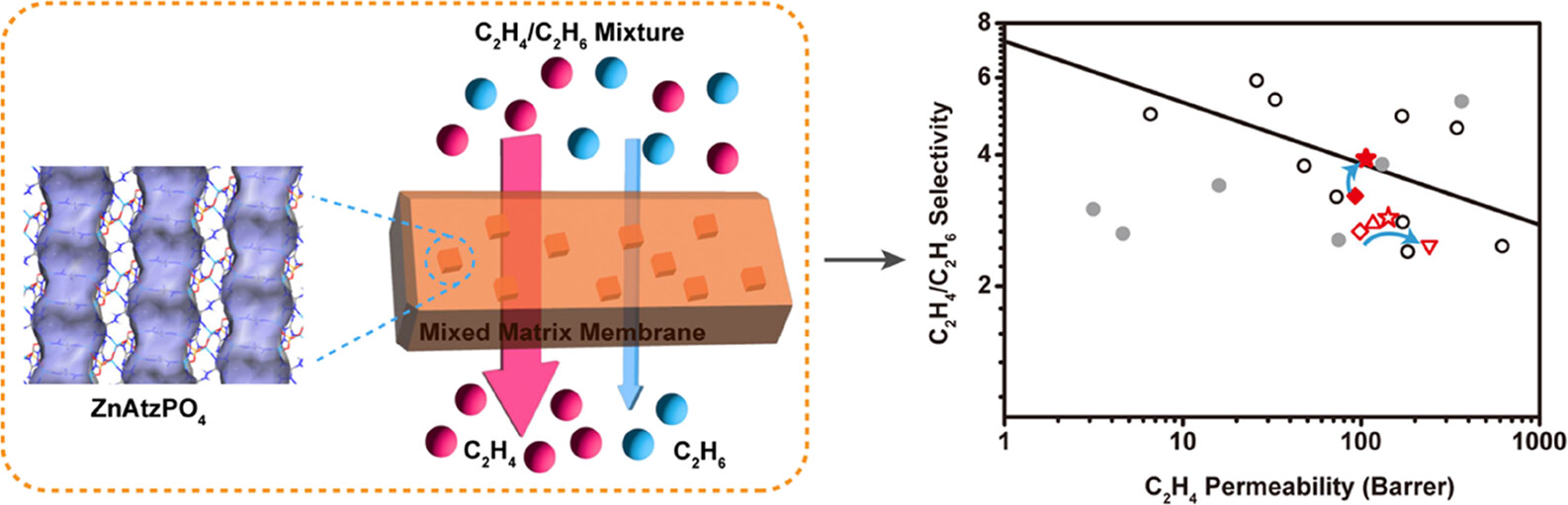 1)开发了一种新型ZnAtzPO4/6FDA-DAM MMMs,ZnAtzPO4填料的独特孔结构和与6FDA-DAM基质的良好相容性有助于同时提高扩散选择性和溶解选择性,实现了突破性的分离性能。在等物质C2H4/C2H6混合气体分离中展现出优异性能,C2H4渗透性为105.0巴勒,C2H4/C2H6选择性为3.90。