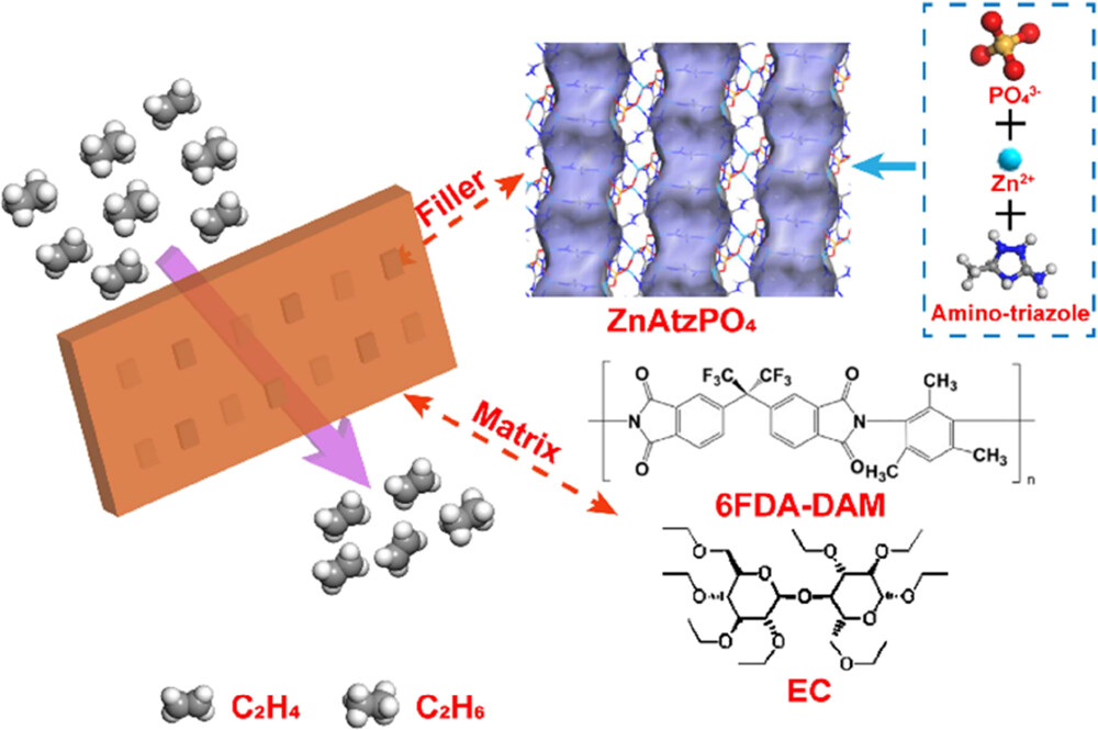 2)本文作者在前人的基础上,开发了一种新型基于磷酸阴离子微孔材料ZnAtzPO4和6FDA-DAM聚合物基质的MMMs,以提高C2H4/C2H6分离性能。
