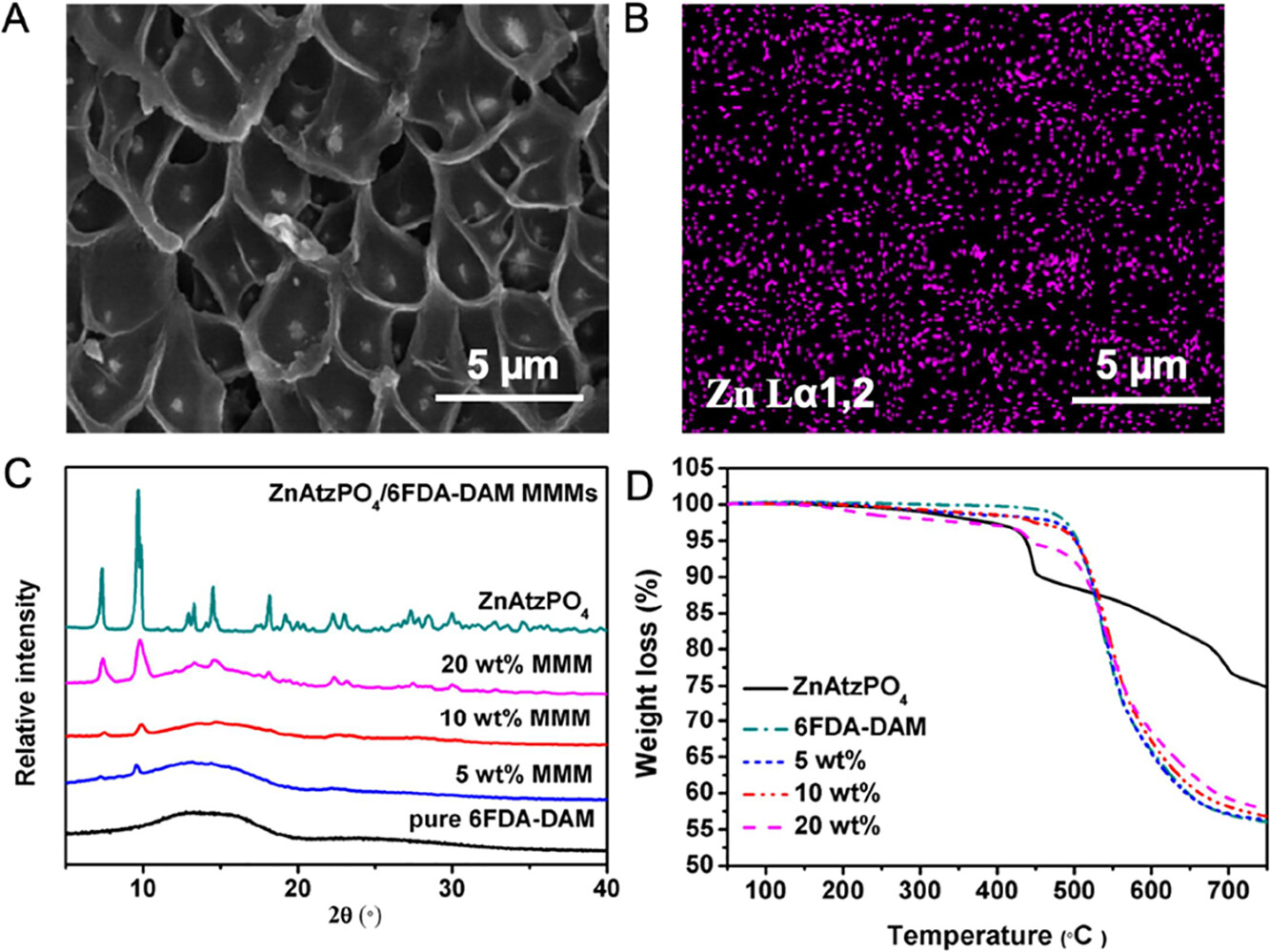 2)SEM和EDS结果显示,当ZnAtzPO4填料含量≤10%时,ZnAtzPO4颗粒在6FDA-DAM基质中分散均匀,无缺陷;当含量≥20%时,出现ZnAtzPO4颗粒团聚现象,形成非选择性空穴。