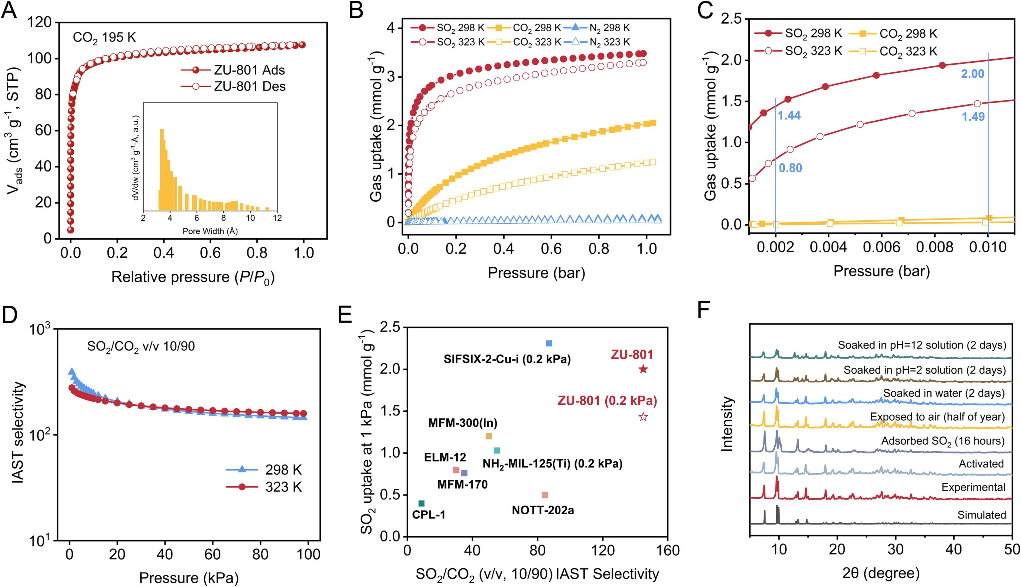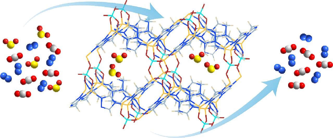 (1) 设计合成了新型高稳定性磷酸盐功能化MOF材料ZU-801,通过调控孔径和孔道化学环境,实现了对低浓度SO2的高容量捕获和优异SO2/CO2、SO2/N2选择性。