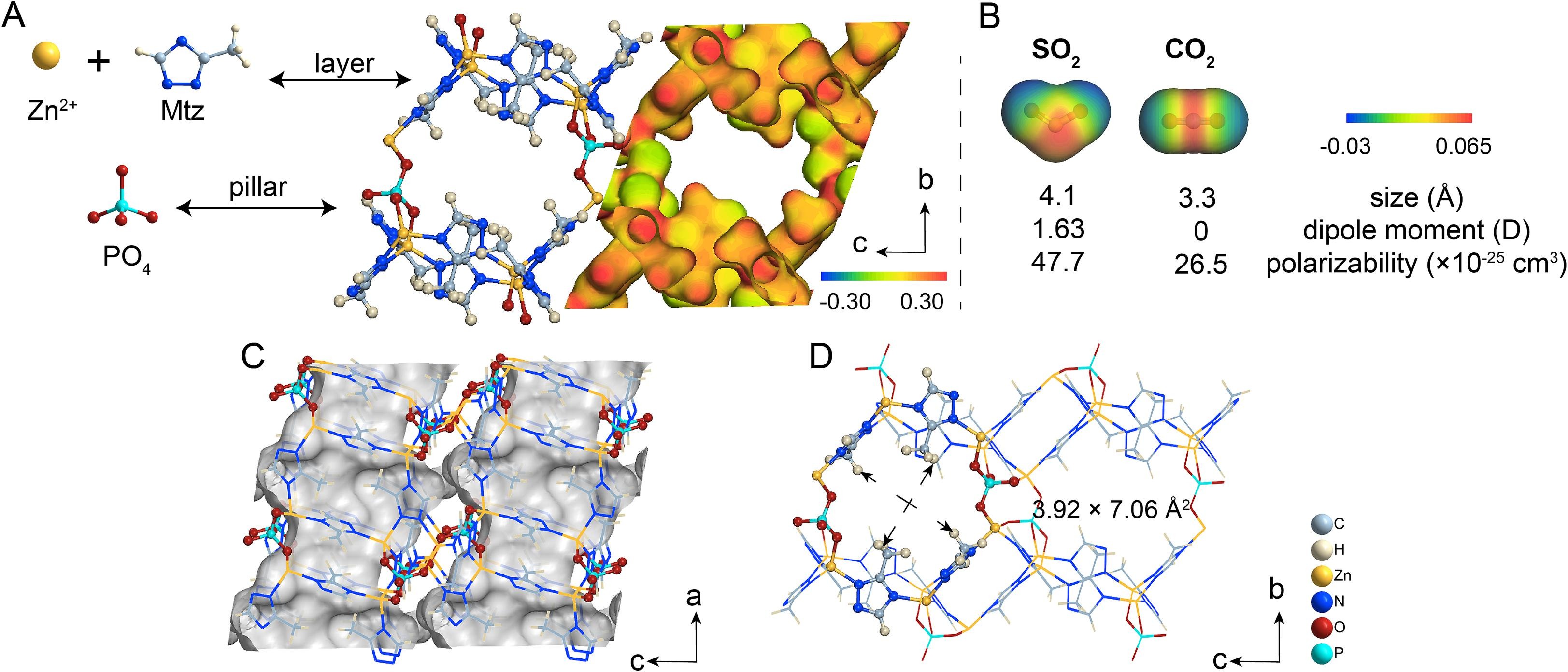 (2) 采用单晶XRD测定了ZU-801的晶体结构,发现其具有周期性膨胀收缩的一维孔道。孔腔表面修饰的甲基和磷酸根基团为气体分子提供高密度结合位点。最窄处孔窗尺寸为3.92×7.06 Å2,增强了对SO2的限域效应。