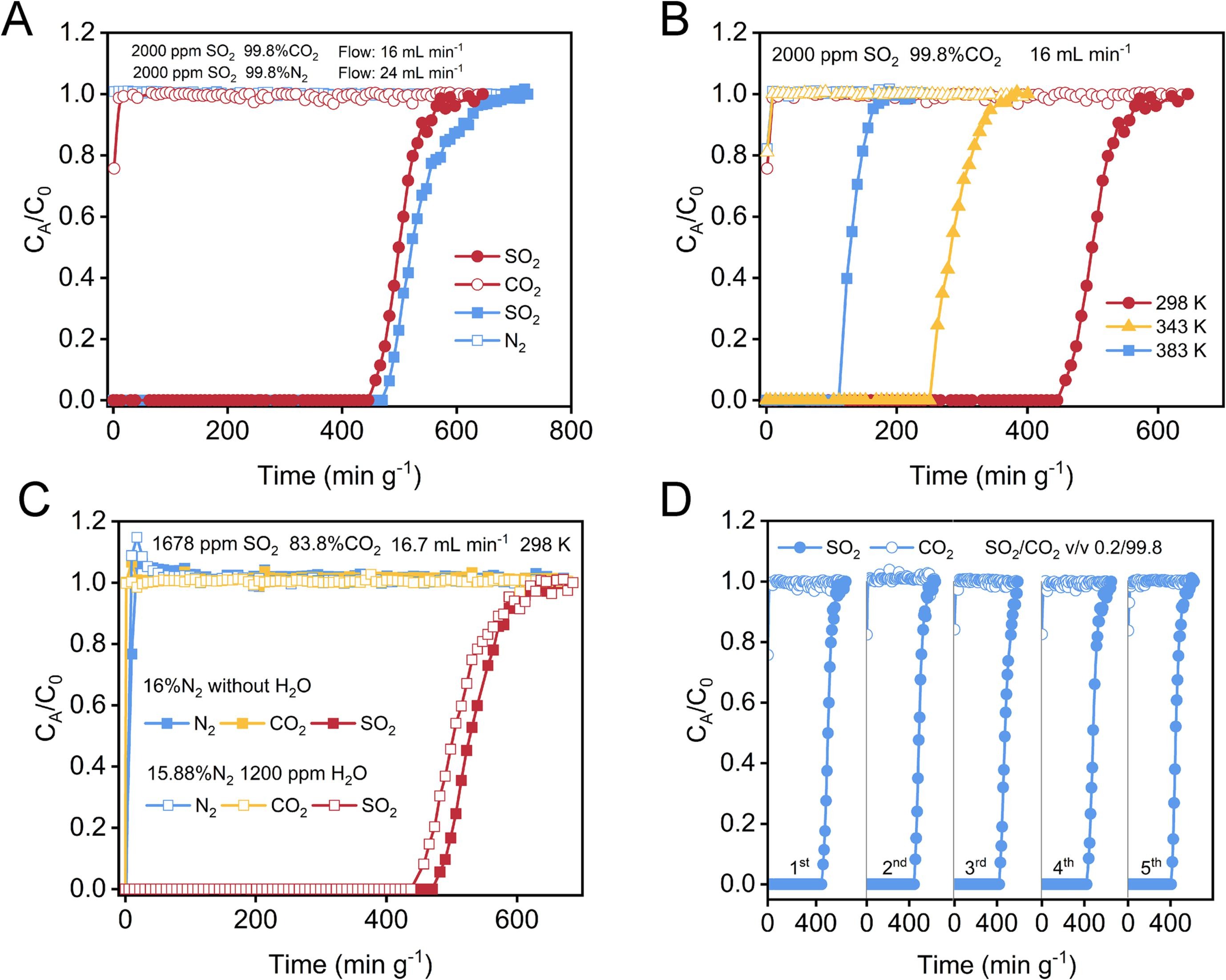 (3) 动态突破实验表明,以2000 ppm SO2的SO2/CO2和SO2/N2混合气为进料,SO2的突破时间分别高达450和475 min/g。当SO2浓度降至200 ppm时,SO2突破时间更是高达4644 min/g。