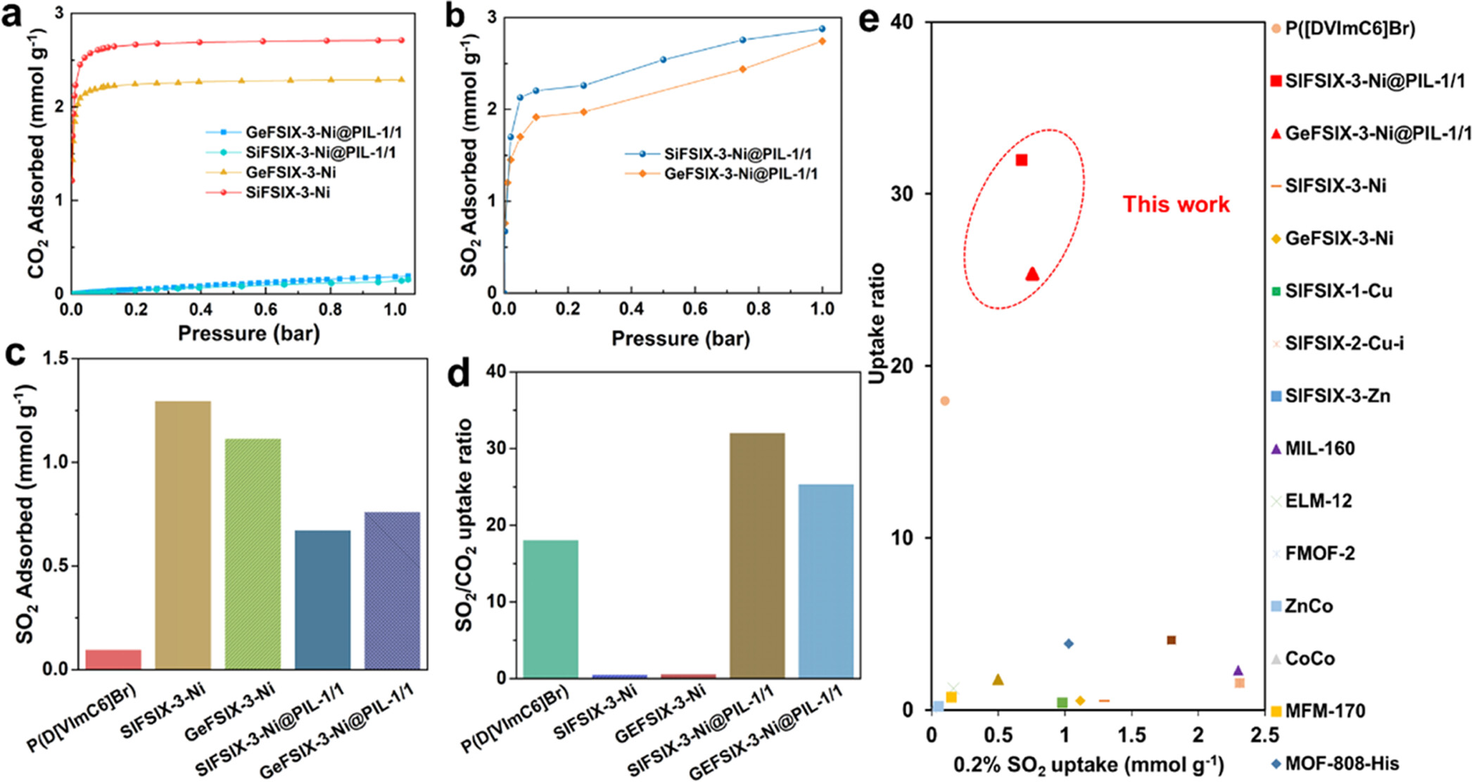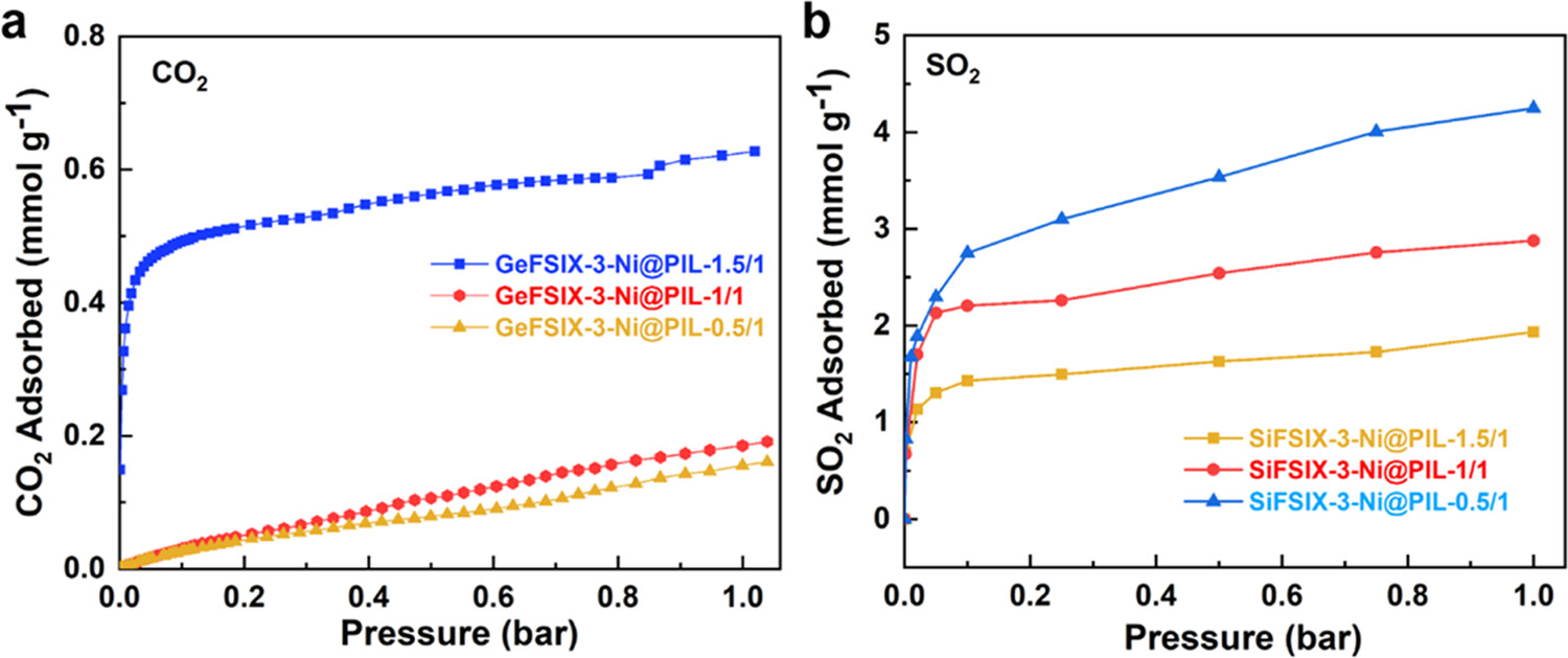 (5) CO2和SO2吸附等温线结果显示,在298K和0.002bar下,SIFSIX-3-Ni@PIL-1/1和GeFSIX-3-Ni@PIL-1/1的SO2吸附量分别达到0.67和0.76 mmol g-1,而在1bar下CO2吸附量极低(分别为0.14和0.18 mmol g-1)。SIFSIX-3-Ni@PIL-1/1实现了32的显著高SO20.2%/CO210%吸附比。