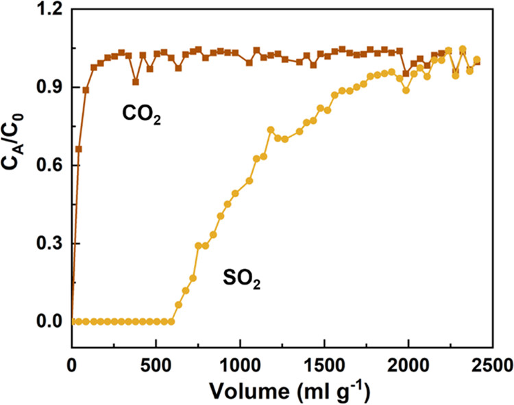(4) 突破实验证实SIFSIX-3-Ni@PIL-1/1具有大的SO2突破保留体积(>1 L g-1),证实了该策略的适用性。