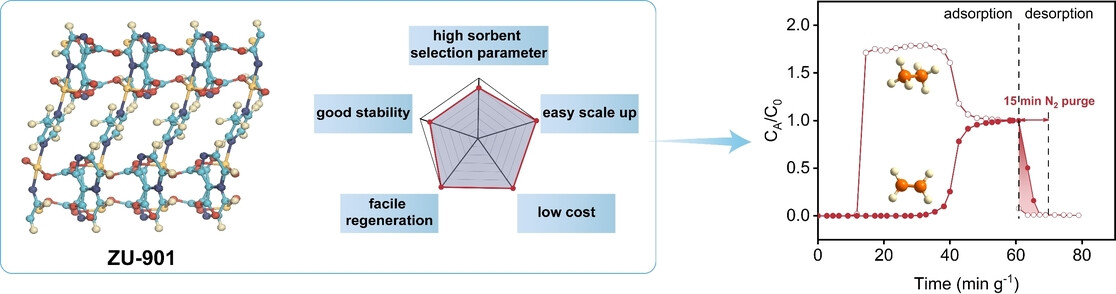 浙江大学邢华斌、杨立峰团队报道的这篇文章(Angew. Chem.Int. Ed. 2023,62, e2022180)中设计了一种新型超微孔金属有机框架材料ZU-901,满足乙烯/乙烷变压吸附分离(PSA)的基本标准。ZU-901表现出"S"形乙烯吸附曲线,具有高吸附选择性参数(65)且易于在温和条件下再生。通过绿色水相合成,ZU-901易于放大合成,产率高达99%,并且在水、酸、碱溶液和循环突破实验中稳定。通过模拟两床PSA工艺,可获得聚合级乙烯(纯度99.51%),相应能耗仅为模拟低温精馏的1/10。本工作展示了孔工程在设计具有理想吸附/解吸行为的多孔材料以实现高效PSA工艺方面的巨大潜力。