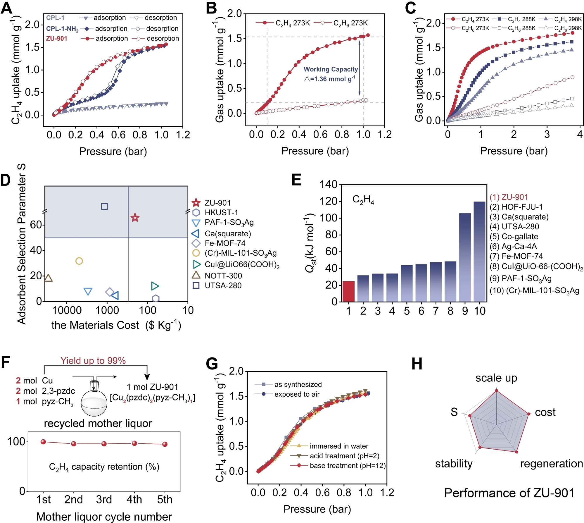 (3) 测试了三种材料对乙烯的吸附行为,发现ZU-901呈现理想的"S"形吸附-脱附曲线,在0.1bar和273K下乙烯吸附量低(0.19 mmol/g),而工作容量高达1.36 mmol/g,乙烷吸附量可忽略不计。