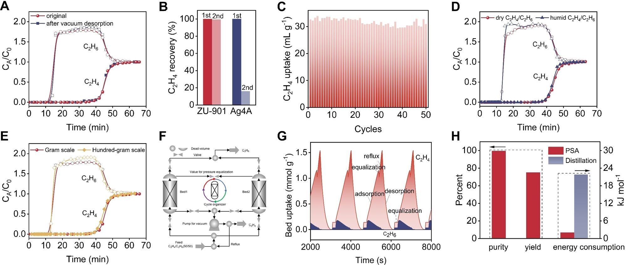 (1) 突破实验表明,由于乙烷吸附量极低,乙烷快速流出,而乙烯持续滞留35分钟。通过抽真空至0.05bar或惰性气体吹扫15分钟,饱和的乙烯可快速解吸再生,收集到的乙烯纯度>95%。相比之下,Ag4A的乙烯回收率仅为16%,远低于ZU-901的99.4%。