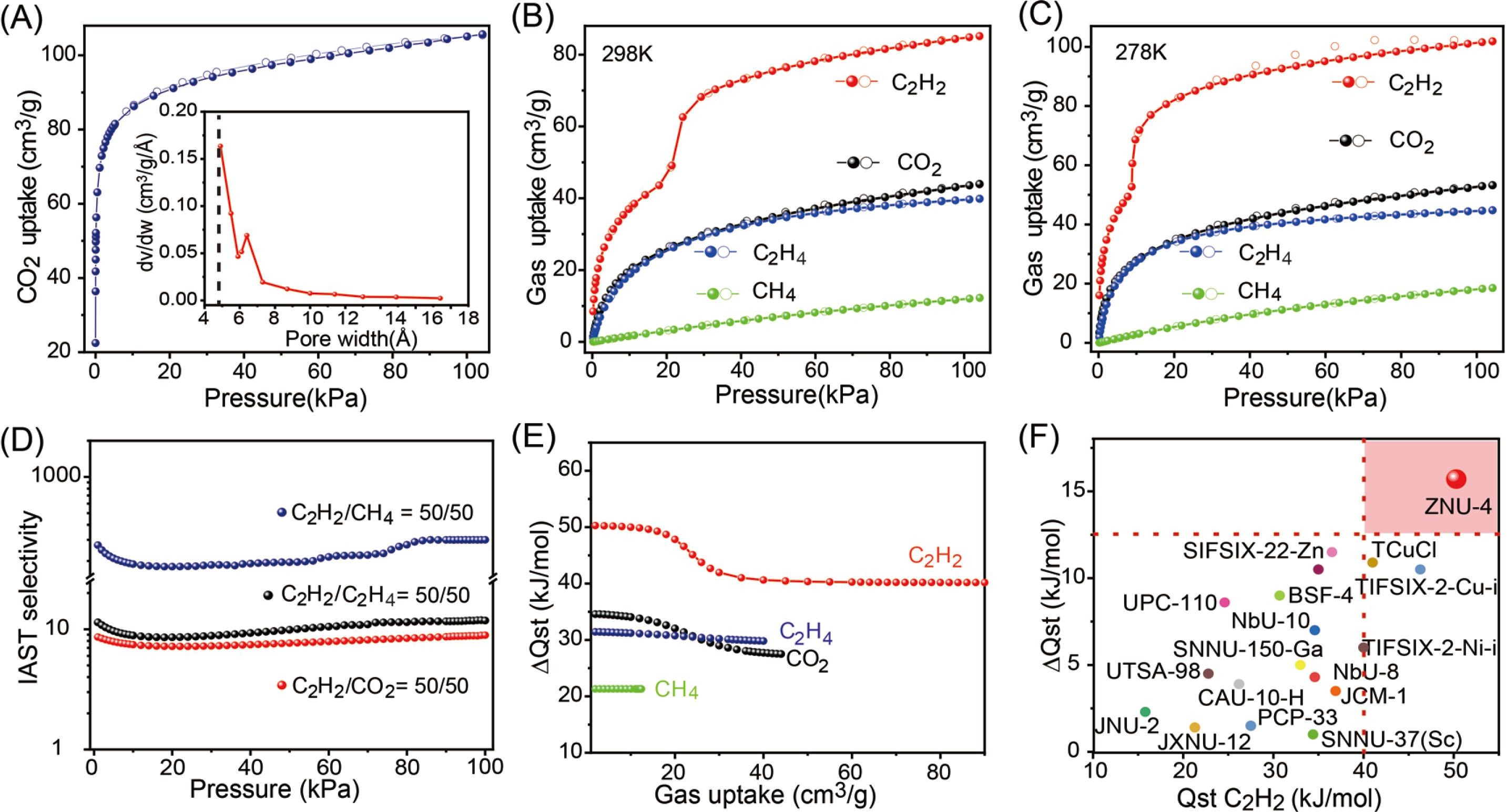 2)ZNU-4表现出优异的乙炔捕获性能,不仅具有高的乙炔吸附量,而且对乙炔相对于CO2、C2H4和CH4具有极高的选择性吸附能力。