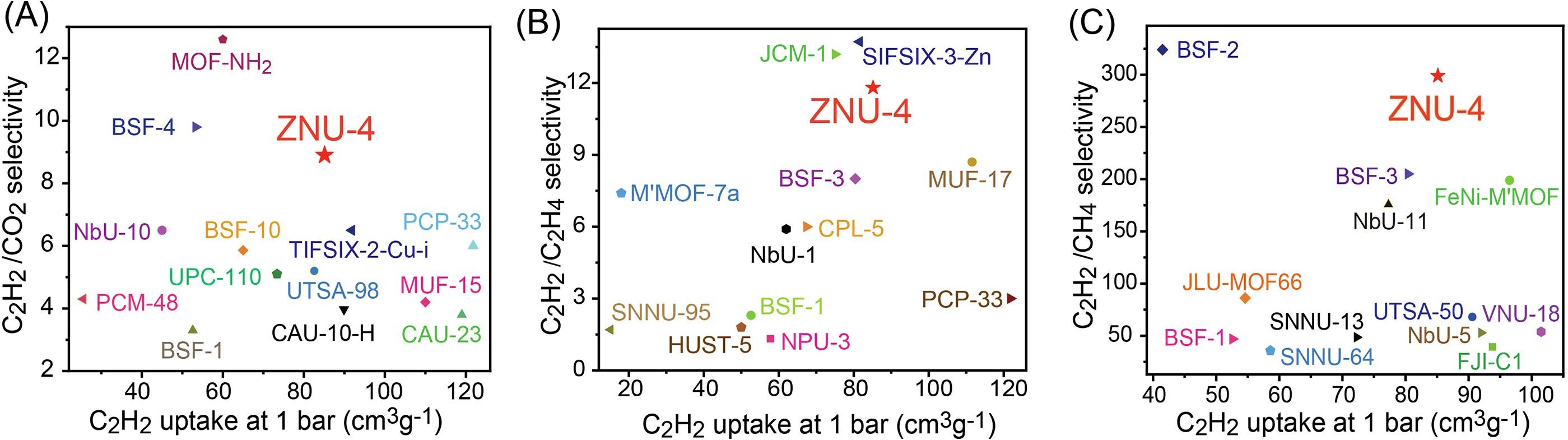 3)计算了ZNU-4对乙炔、CO2、C2H4和CH4的IAST选择性,结果显示对乙炔具有极高的选择性(C2H2/CO2为9,C2H2/C2H4为12,C2H2/CH4为300)。