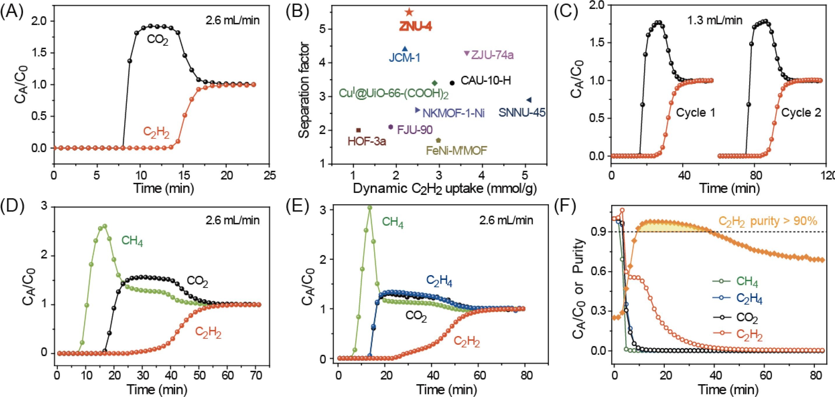 3)动态实验证实了ZNU-4从复杂多组分混合物中高效分离乙炔的实际应用前景。