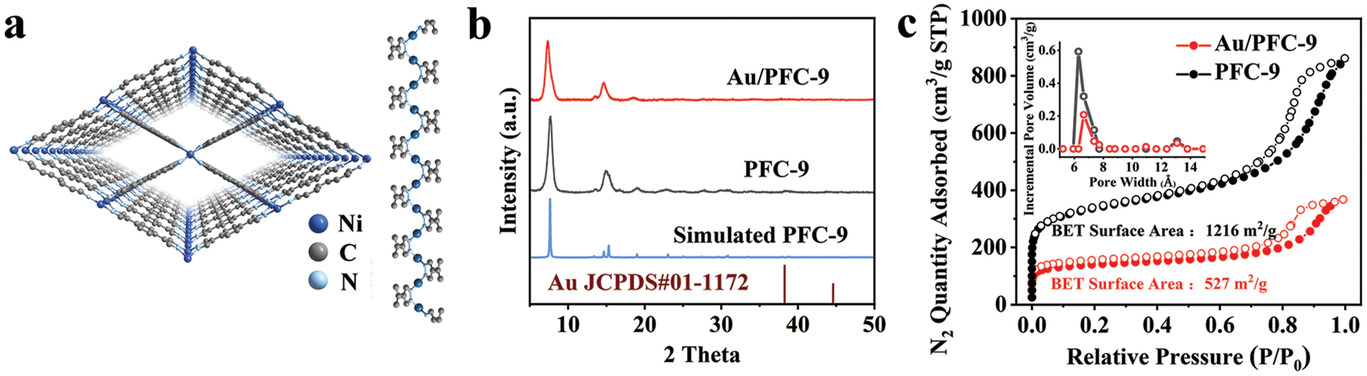 (1) 合成了PFC-9和Au/PFC-9复合材料,采用PXRD、N2吸附(BET:1216 m2 g−1)、ICP-OES、SEM、HAADF-STEM、EDX mapping和HRTEM等手段表征了材料的结构、形貌和组成。