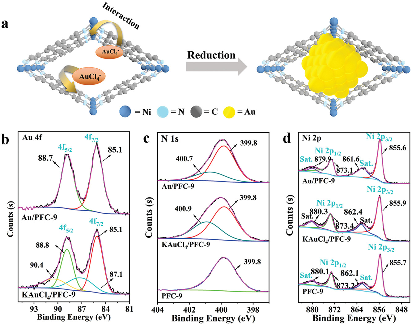 (3) XPS分析揭示,Au物种初始和最终针定位点是PFC-9结构中的NPz原子,实现了Au与(-Ni-NPz-NPz-)∞链的紧密接触。