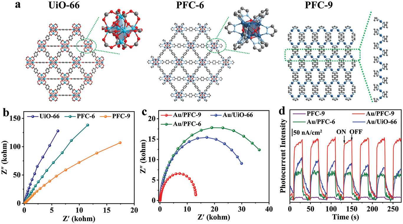 (3) EIS阻抗谱显示电荷传输阻力顺序为UiO-66 > PFC-6 > PFC-9,Au/PFC-9电阻最小,证实了PFC-9优越的电荷传输性能和Au/SBUs界面的丰富性。