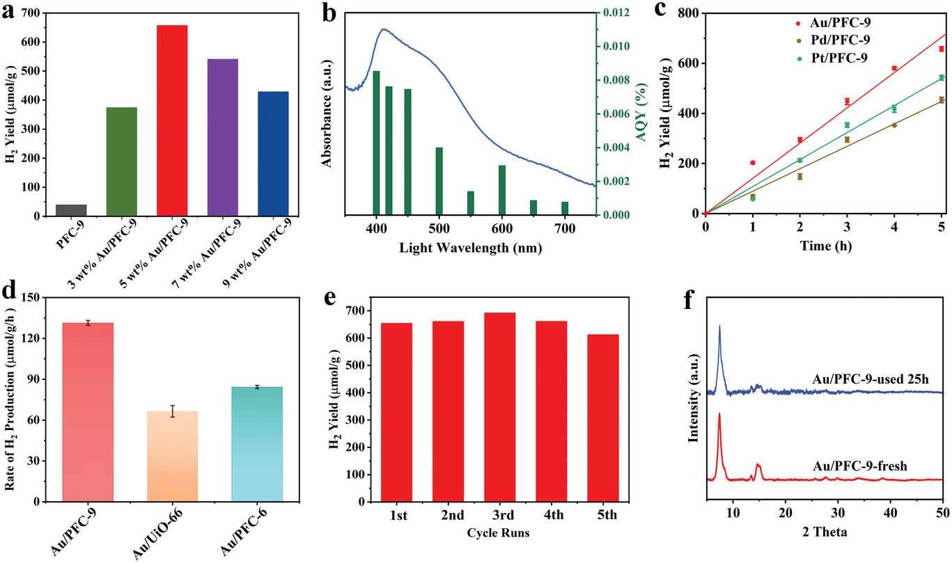 (3) 与Pt/PFC-9和Pd/PFC-9相比,Au/PFC-9的光催化产氢活性更高,主要归因于Au纳米颗粒在可见光区的LSPR光敏作用,而非HER催化作用。
