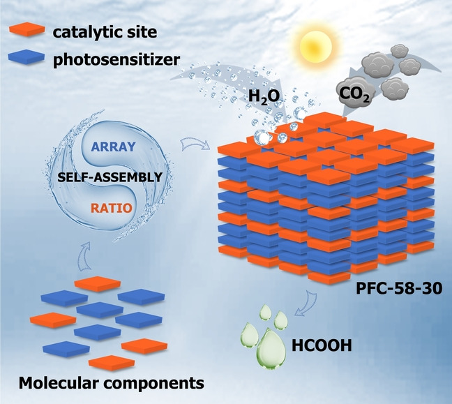 (1) 通过自组装金属卟啉形成一系列高度多孔的HOF材料用于CO2光还原,通过控制金属卟啉含量可将光合组分(催化剂和光敏剂)精细调控至100%、61%和30%。